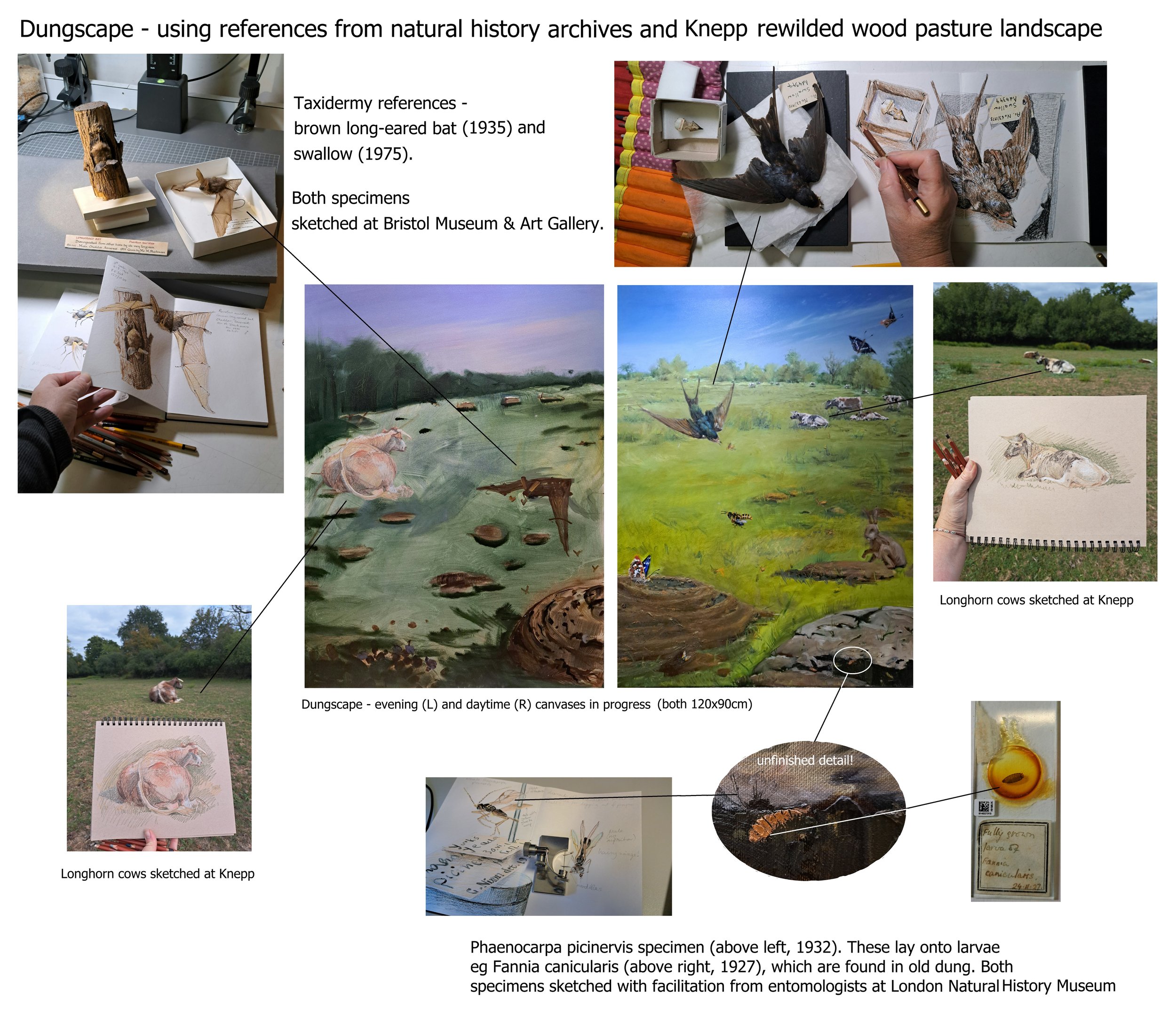 “Dungscape” draws on museum natural history collections and rewilding projects to inform a series of (in progress) oil paintings. These landscapes demonstrate the wildlife community that thrives around dungpats in the absence of chemical pesticides and fertilizers.